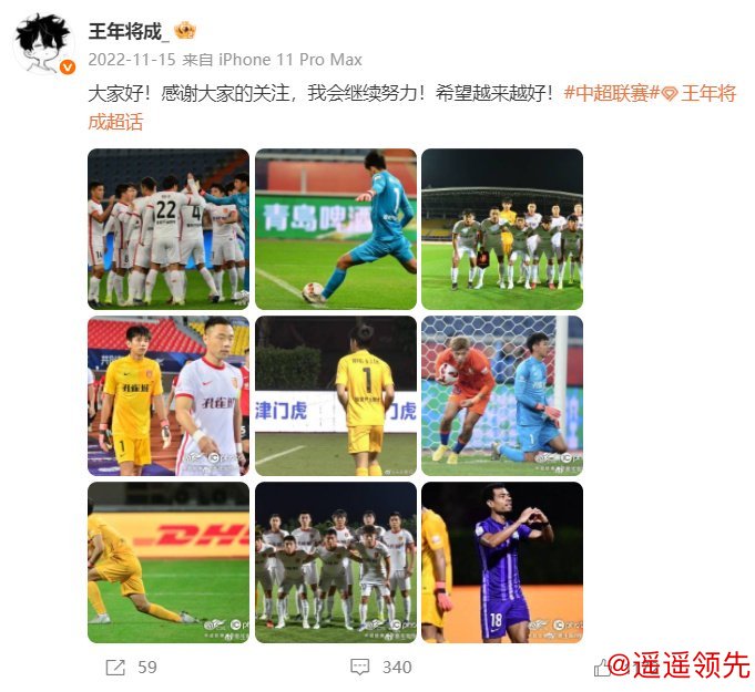2022年前后,王年将成的微博,内容聚焦在个人的中超球员生涯,分享训练日常和比赛精彩照片: